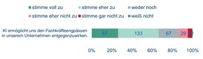 66 Prozent der 449 Befragten schätzen, dass KI-Einsatz zeigt, wie innovativ Unternehmen aufgestellt sind und dies wiederum die Attraktivität des Arbeitsplatzes für Fachkräfte erhöht. 45 Prozent gehen davon aus, das KI sogar die Motivation Beschäftigter steigert und 58 Prozent, das die Lernförderlichkeit erhöht wird. Das KI hilft die Komplexität der Tätigkeiten zu reduzieren, davon gehen 53 Prozent der Befragten aus.