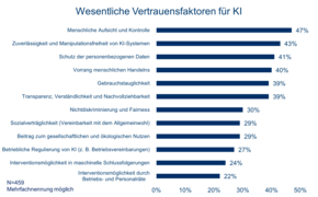 Auf die Frage hin, welche Vertrauensfaktoren in Bezug auf Künstliche Intelligenz als wesentlich erachtet werden, antworteten beinahe 50 Prozent der Befragten, dass menschliche Aufsicht und Kontrolle am wichtigsten seien. Ein weiterer relevanter Punkt ist die Zuverlässigkeit und Manipulationsfreiheit von KI-Systemen sowie der Schutz von personenbezogenen Daten. Dass den Betriebs- und Personalräten eine Interventionsmöglichkeit zukommt, haben die Befragten nur zu 22 Prozent für ihr Vertrauen als wesentlich erachtet.