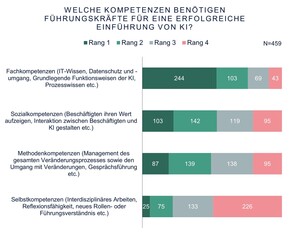 Führungskräfte benötigen für die erfolgreiche Einführung von Künstlicher Intelligenz Kompetenzen. Sie benötigen vor allem Fach-, Sozial-, Methoden und Selbstkompetenzen. Im Rahmen der ifaa-Studie bewerteten die 459 Teilnehmenden die KI-Fachkompetenzen als am wichtigsten, um den digitalen Transformationsprozess zu gestalten. Gefolgt von den Sozial- und Methodenkompetenzen. Auf dem vierten Platz liegen nach den 459 Teilnehmenden die Selbstkompetenzen von Führungskräften.