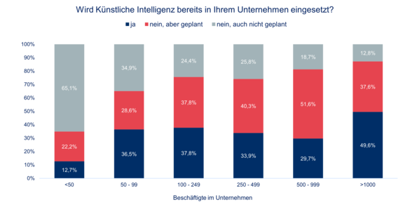 Größere Unternehmen erweisen sich als Vorreiter beim Einsatz von KI in der Praxis. Größere Unternehmen nutzen bzw planen KI im Vergleich zu kleinen und mittleren Unternehmen verstärkt. 50% der Studienteilnehmenden aus Unternehmen mit mehr als 1000 Beschäftigten geben an, dass in ihrem Unternehmen bereits KI eingesetzt wird, Weitere 38% dieser Teilstichprobe bestätigen die Planung des KI-Einsatzes. Im Vergleich hierzu geben 65% der Studienteilnehmenden, welche in Kleinstunternehmen mit weniger als 50 Beschäftigten arbeiten an, dass KI weder eingesetzt noch ihr Einsatz geplant ist.