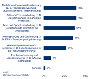 Bezüglich der Technologien, die im Rahmen der geplanten oder umgesetzten KI-Anwendungen zum Einsatz kommen, wurden die Bild und Tonverarbeitung sowie die multidimensionale Mustererkennung mit 39 Prozent am häufigsten genannt. Unweit dahinter lag die Text- und Sprachverarbeitung mit 37 Prozent, dicht gefolgt von der Aktionsplanung und Optimierung mit 35 Prozent. Deutlich seltener wurde der Bereich der Wissensrepräsentation und Semantik mit 27 Prozent genannt und noch weit dahinter lag die Emotionserkennung und Absichtsanalyse mit gerade einmal 9 Prozent.