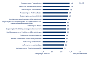66% der Befragten aus Unternehmen, in denen bereits KI eingeführt wurde bzw. eine Einführung geplant ist, stimmen (voll) zu, dass KI es ermöglicht, den Fachkräfteengpässen entgegenzuwirken. Große Potenziale werden in der Produktivität- und Effizienzsteigerung von Prozessen gesehen (Zustimmung ca. 71%). Eine Aufwertung der Arbeitsplätze durch die Einführung von KI sehen 54% der Befragten. 57% dieser Befragten sind dabei der Meinung, dass KI dazu beiträgt, dass die Beschäftigten sich auf interessantere Arbeitsaufgaben konzentrieren können. 53% sehen das Potenzial, dass das Wissen der Beschäftigten gesichert werden kann.