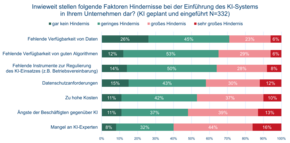 Der Mangel an KI-Expertise in Unternehmen stellt nach Einschätzung der 332 Befragten ein großes (44 Prozent) bis sehr großes Hindernis (16 Prozent) dar. Gefolgt vom Faktor „Ängsten der Beschäftigten vor KI“. Hier geben 39 Prozent an, dass sie dies für ein großes Hindernis halten und 13 Prozent sogar für ein sehr großes. Weitere große Hindernisfaktoren können laut Einschätzung der Befragten zu hohen Kosten sowie Datenschutzanforderungen sein. Dahingegen werden die fehlende Verfügbarkeit von guten Algorithmen sowie Daten von über 50 Prozent der Befragten als geringes oder gar kein Hindernis angesehen.