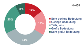 Die Befragten wurden nach einer Einschätzung der Bedeutung von KI für ihr Unternehmen gefragt. Die Auswertung ergab eine auffällige Drittelung der Meinungsverhältnisse. Ein 33 prozentiger Anteil entfiel jeweils auf jene, die KI entweder eine höchstens geringe oder eine mindestens große Bedeutung beimessen. Auf nur ein Prozent mehr kam der Anteil der Befragten, die sich hinsichtlich der Bedeutung unsicher sind und mit „Teils, teils“ antworteten.