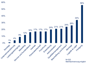 Die Befragten der Teilstichprobe (KI eingeführt oder geplant; N=332) wurden nach einer Zuordnung der geplanten oder realisierten KI-Anwendung zu einem Funktionsbereich in ihrem Unternehmen gefragt. Da der Bereich der Fertigung der in der Stichprobe am häufigsten vertretene ist, überrascht es nicht, dass dieser bei der Bereichszuordnung der geplanten oder eingeführten KI-Anwendung mit 56 Prozent ebenfalls an oberste Stelle gelangt ist. Am zweithäufigsten wurde mit 34 Prozent der Bereich Logistik & Lager sowie darauffolgend mit 26 Prozent die Montage genannt. Mit lediglich knapp 4 Prozent nannten dagegen die Befragten den Bereich der Unternehmensführung.