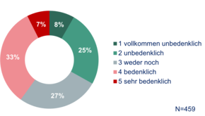 Auf die Frage „Wie bedenklich schätzen Sie den Einsatz von KI generell ein?“ antworteten 40 Prozent aller Befragten (N=459) mit bedenklich bzw. sehr bedenklich. Lediglich 33 Prozent der Studienteilnehmenden empfinden den Einsatz von KI als (vollkommen) unbedenklich. Der hohe Anteil bei der Antwortoption „weder, noch“ verdeutlich die Unsicherheit bei der Beantwortung der Frage.