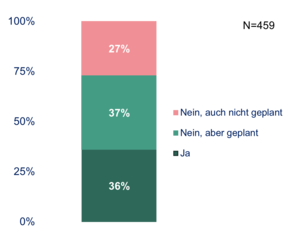 Auf die Frage, ob künstliche Intelligenz bereits im Unternehmen eingesetzt wird, antworteten 36 Prozent der Befragten, dass dies bereits der Fall sei. Weitere 37 Prozent gaben an, dass künstliche Intelligenz zumindest in Planung ist und nur 27 Prozent verneinten auch die Planung. Eine weitere Aufschlüsselung der Anzahl der Anwendungen bei jenen, die die Frage nach der KI-Einführung bejahten, ergab, dass 82 Prozent mindestens 2 Anwendungen realisiert haben.