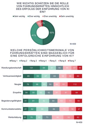Führungskräfte besitzen eine entscheidende Rolle bei der Einführung von Künstlicher Intelligenz. 50% der 459 Teilnehmenden attestieren Führungskräften eine sehr wichtige Rolle, wenn es um die erfolgreiche Einführung von KI geht. Insgesamt bezeichnen 91% der Teilnehmenden die Rolle von Führungskräften als sehr oder eher wichtig.