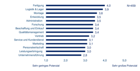 Darüber hinaus wurden die Befragten der Gesamtstichprobe nach einer allgemeinen Einschätzung des KI-Potenzials für die angegebenen Unternehmensbereiche gebeten. In beinahe gewohnter Reihenfolge wurde der Fertigung das größte Potenzial zugesprochen, dicht gefolgt vom Bereich Logistik & Lager sowie kurz darauf der Montage. Der Unternehmensführung wurde hier das geringste Potenzial beigemessen.