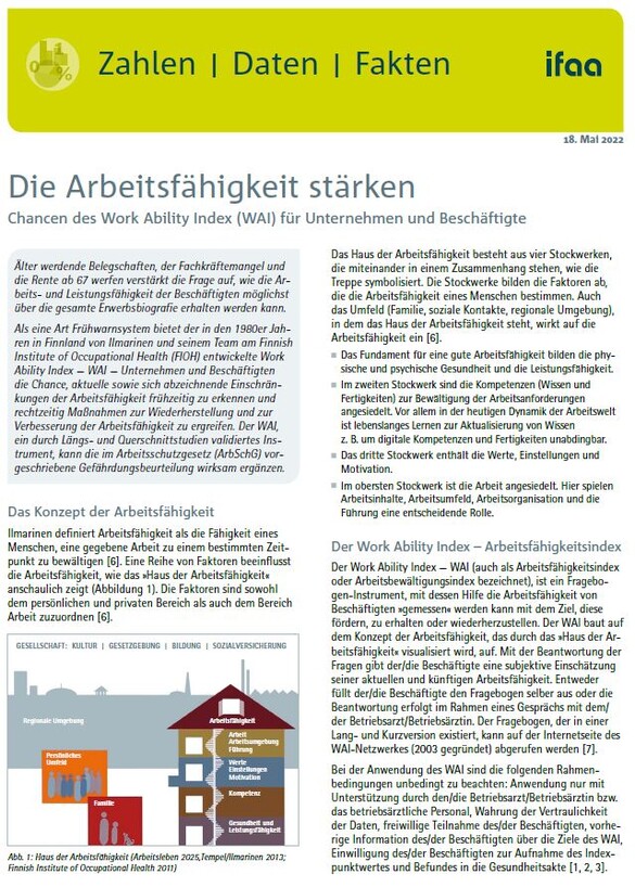 Älter werdende Belegschaften, der Fachkräftemangel und die Rente ab 67 werfen verstärkt die Frage auf, wie die Arbeits- und Leistungsfähigkeit der Beschäftigten möglichst über die gesamte Erwerbsbiografie erhalten werden kann. Als eine Art Frühwarnsystem bietet der in den 1980er Jahren in Finnland von Ilmarinen und seinem Team am Finnish Institute of Occupational Health (FIOH) entwickelte Work Ability Index — WAI — Unternehmen und Beschäftigten die Chance, aktuelle sowie sich abzeichnende Einschränkungen der Arbeitsfähigkeit frühzeitig zu erkennen und rechtzeitig Maßnahmen zur Wiederherstellung und zur Verbesserung der Arbeitsfähigkeit zu ergreifen. Der WAI, ein durch Längs- und Querschnittstudien validiertes Instrument, kann die im Arbeitsschutzgesetz vorgeschriebene Gefährdungsbeurteilung wirksam ergänzen.