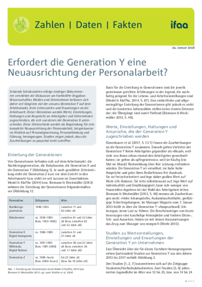 Die Generation Y so ist vielfach in Medien zu lesen - unterscheide sich in ihren Lebenszielen und in ihren Erwartungen an den Arbeitgeber deutlich von der Generation X und den Babyboomern. Sie sei anspruchsvoll, verwöhnt, freizeitorientiert. Sie sei „pflegeintensiv“, da sie häufige Rückmeldung über ihre Leistung einfordern würde. Sie habe hohe Jobansprüche und lege Wert auf Work-Life-Balance und Auslandsaufenthalte. Das alles erfordere eine Neuausrichtung der Personalarbeit. Kommen jedoch die „Betroffenen“ selber zu Wort, ändert sich das Bild. Das ifaa hat verschiedene Studien ausgewertet und das Ergebnis in einem Faktenblatt zusammengestellt.